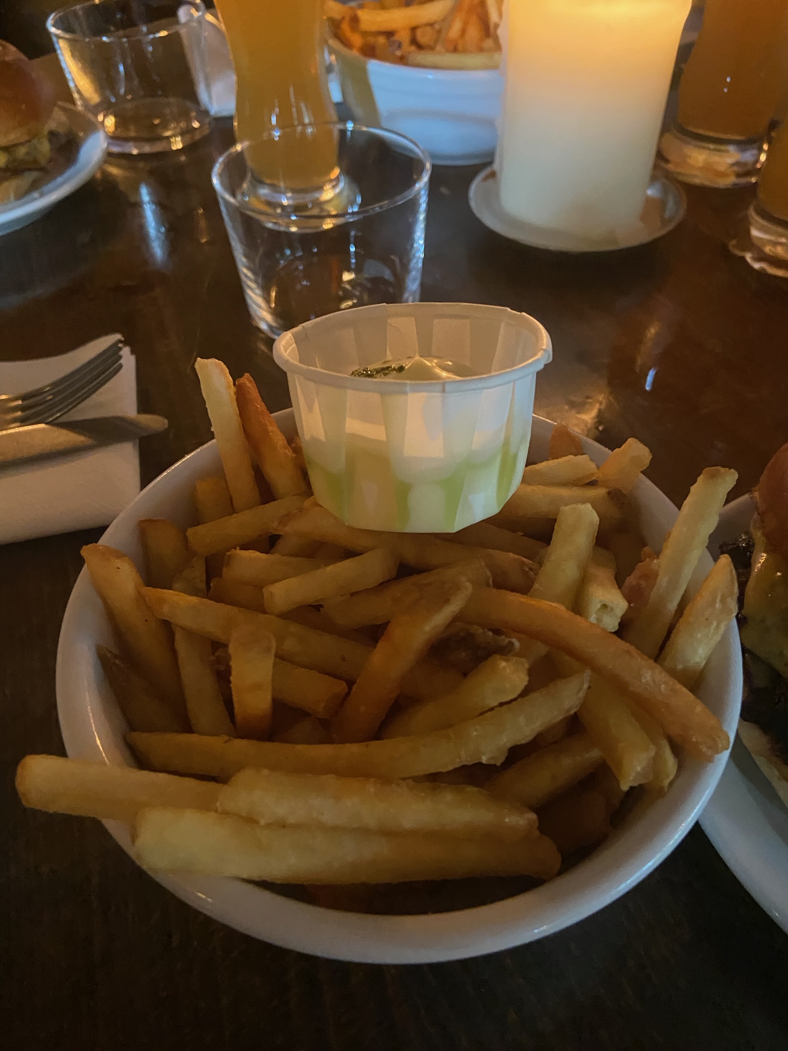Franse frietjes: dun, krokant, licht gezouten. Met mayo. De eenvoud is opvallend. Geen poespas, geen gekke mayo’s, geen toppings. Gewoon friet zoals friet bedoeld is. Hier draait het om eenvoud. Niet ons meest favoriete friet maar het smaakte wel. Tevens ook een royale portie.