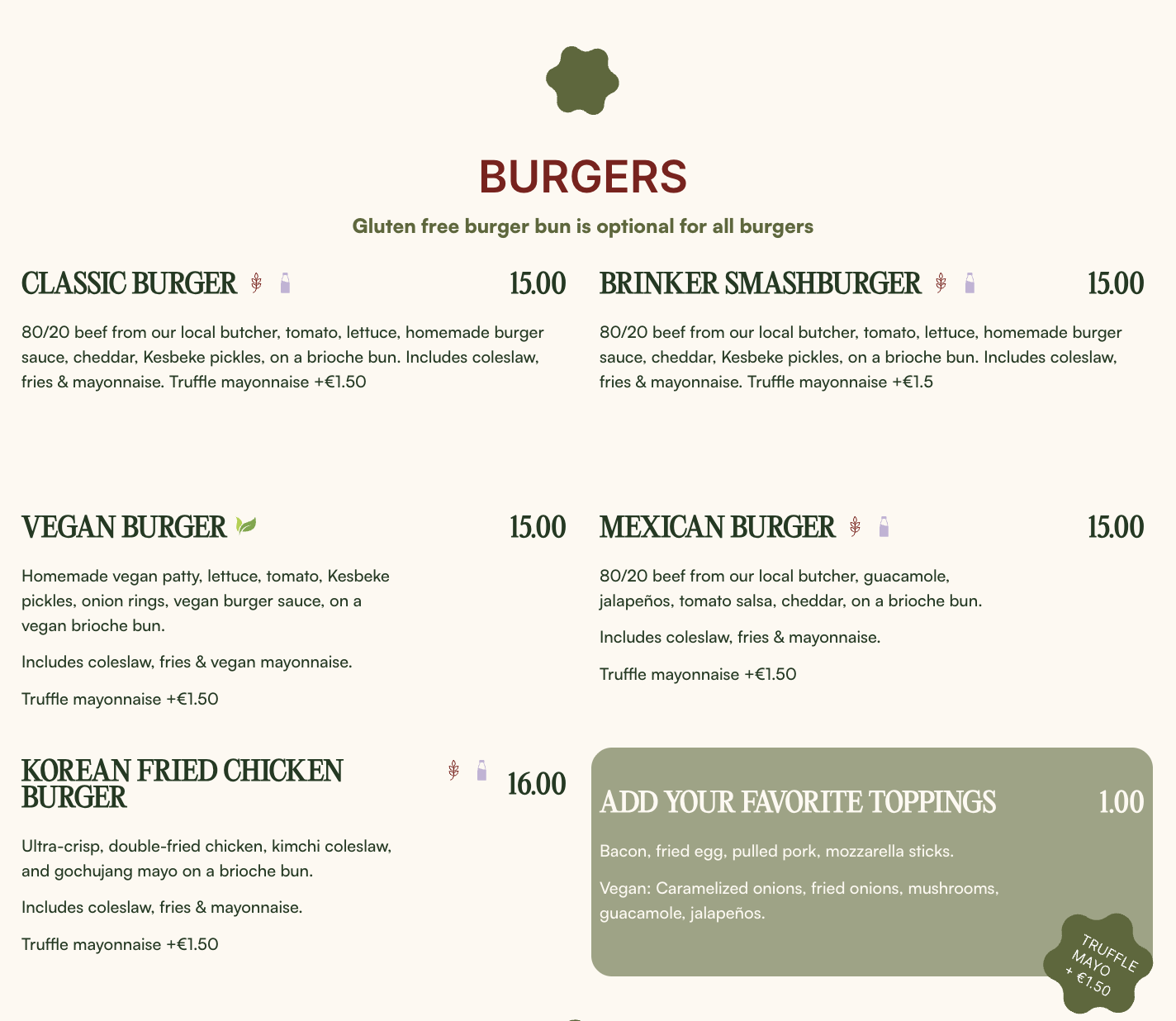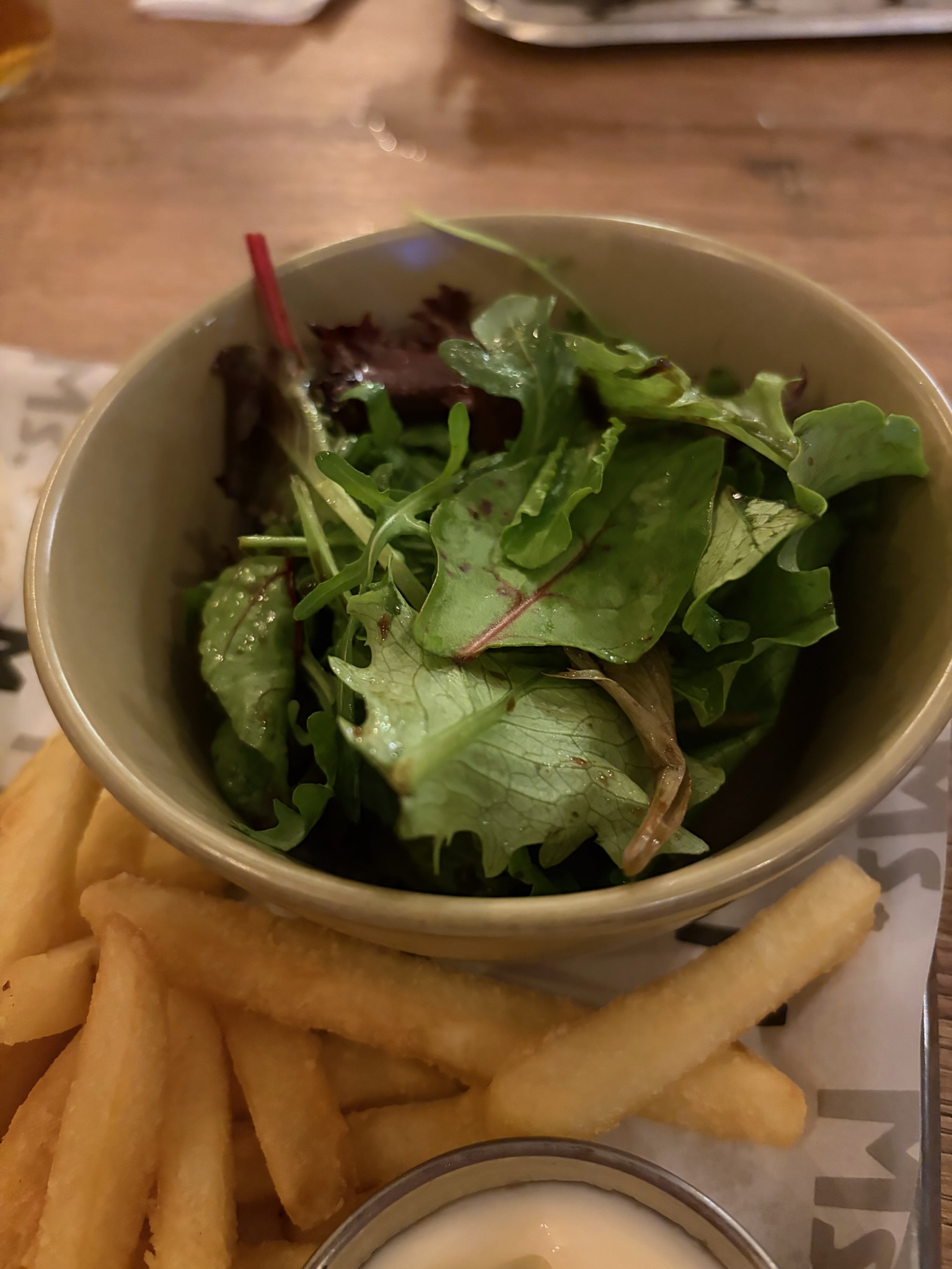 Zoals in de intro al genoemd is de nieuwe menukaart flink afgeslankt. Dat terwijl op de menukaart online en ten tijde van ons eerdere bezoek meer opties stonden dan in werkelijkheid het geval was. Het menu dat leidend is, daar staat nu nog maar 1 burger op; de Brinker Burger. Dit was voorheen de Brinker Smashburger. Waar we eerder uit 3 burgers konden kiezen heb je nu geen keuze meer. Bij deze burger krijg je overigens wel standaard friet en groene salade waar je voorheen ook nog coleslaw erbij kreeg. We voelden ons toch wel een beetje beroofd.
