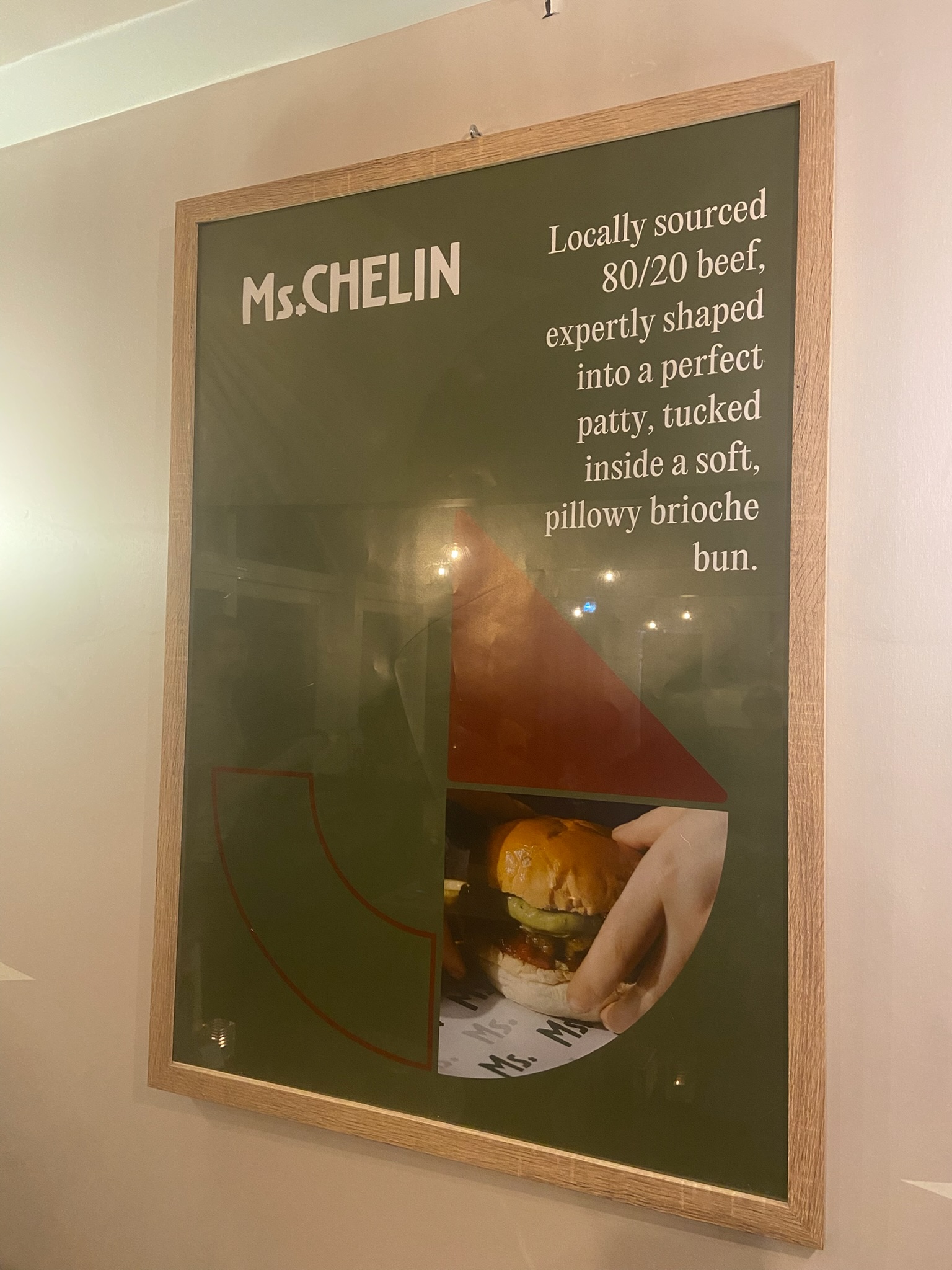 Ms.Chelin voelt als een plek die niet echt moeite doet. Het concept, de uitvoering en de menukaart zijn allemaal zonder passie. Wij waren niet bepaald onder de indruk en ze hebben het zelfs voor elkaar gekregen om met de slechte muziekkeuze ons weg te jagen. Deze burger was dan ook een behoorlijke tegenvaller. Zonder ziel, zonder karakter, zonder reden om terug te komen. Dit was geen maaltijd, dit was een beroving.